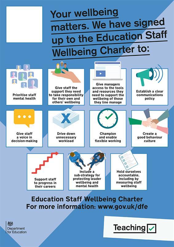 The DfE Education Staff Wellbeing charter is a declaration of support for, and set of commitments to, the wellbeing and mental health of everyone working in education. All state funded schools and colleges are invited to sign up to the charter, as a shared commitment to protect, promote and enhance the wellbeing of their staff. Sign up is voluntary and there is no deadline to sign up.